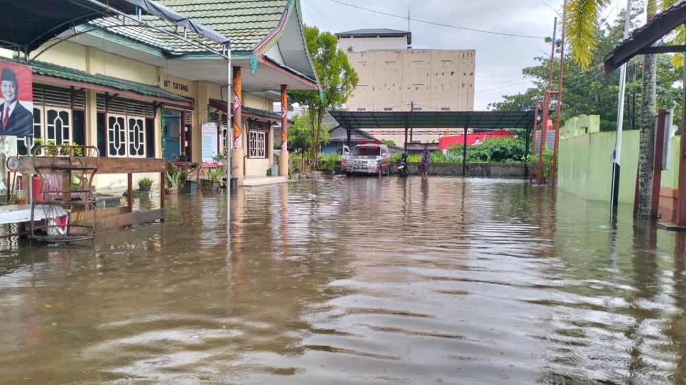 Luberan air akibat curah hujan yang tinggi, juga membuat halaman Kantor Kelurahan Mentawa Baru Hilir tergenang. Kedalamannya hingga mencapai 30 centimeter. Aktivitas pelayanan pun sedikit terganggu. (kim.mb-hilir1)