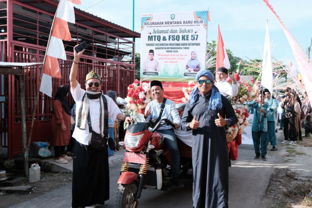 SAMPIT - Kelurahan Mentawa Baru Hilir mengikuti Pawai Taaruf dalam rangkaian kegiatan MTQ dan FSQ Tingkat Kecamatan Mentawa Baru Ketapang, Kamis pagi (23/04/2026). Mereka tampil kompak dengan balutan busana Islami. Kendaraan tosa yang dihias dipenuhi berbagai aneka bunga menjadi pembeda dengan peserta lain.